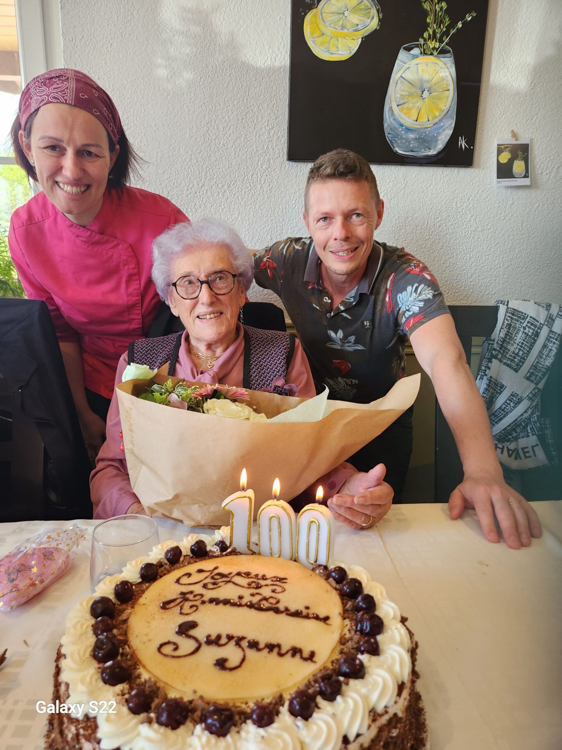 Ce week-end à l’auberge nous avons eu la joie et l’honneur de fêter l’anniversaire de Suzanne. Et quel chiffre…… 100 Ans !!!!!. Une dame encore très dynamique, qui, pour la petite histoire avais confectionné sa propre tenue de scène !!! 😉👍